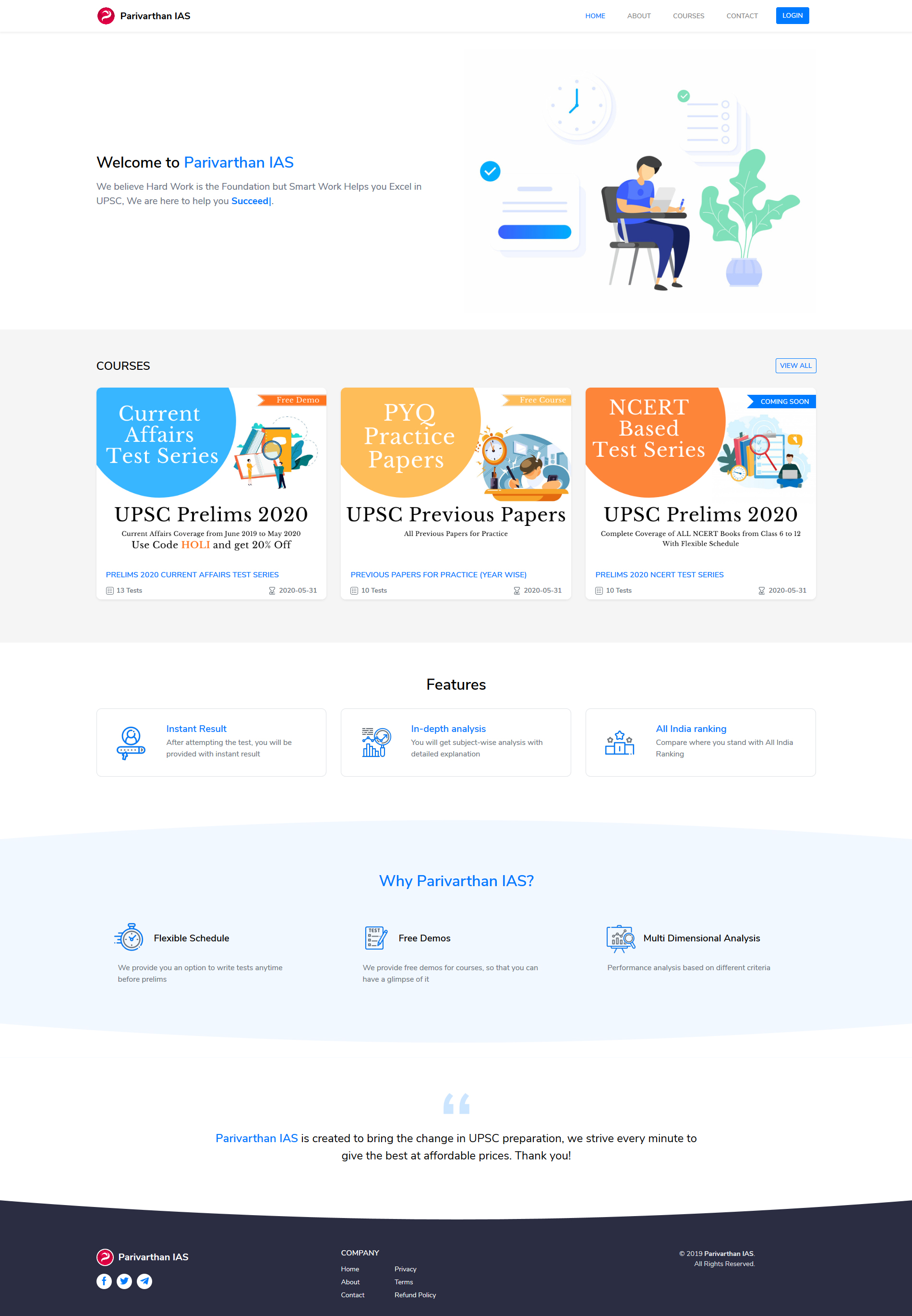 Parivarthan IAS is an online examination system which helps prepare students for the competitive exams for government jobs. The website has a variety of courses which can be subscribed and it provides analysis, solution and ranking to students which prepares them for the actual competition.